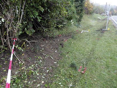 Parece ser que empezó a dar vueltas desde más atrás, fijaos en la siguiente imagen, pierde el control y sobre la yerba el coche es ingobernable: el jardín tiene marcas de que el coche cogió impulso con esa pequeña pendiente: